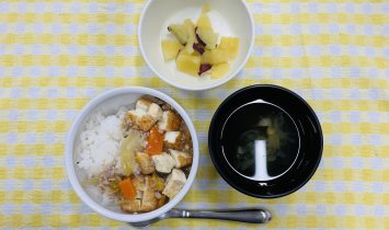 そぼろ粥・さつま芋煮厚揚げの中華丼・さつま芋のりんご煮・わかめスープ牛乳・おはぎ…