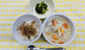全粥・冬野菜のクリーム煮・ブロッコリーの柔らか煮御飯・ふりかけ(じゃこ・ねぎ)・冬野菜のクリーム煮・ブロッコリーのごま和えさつま芋スティック・牛乳…