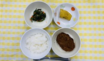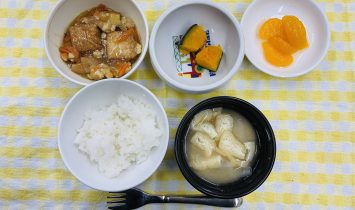全粥・ささみのとろみ煮・小松菜のツナ煮・かぼちゃ汁御飯・鶏肉のマーマレード焼き・小松菜のツナサラダ(キャベツ)・豚汁(かぼちゃ)牛乳・米粉の蒸しパン(小豆)…