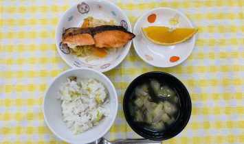 菜飯(小松菜)・さわらの塩焼き・じゃがいものきんぴら・豆腐のみそ汁(チンゲン菜)菜飯(小松菜)・さわらの塩焼き・じゃがいものきんぴら・豆腐のみそ汁(チンゲン菜)ハッピーターン・牛乳…