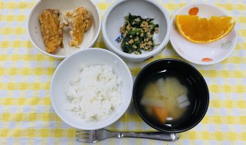 御飯・ササミのレモン煮・納豆和え(ほうれん草)・みそ汁(大根・にんじん)オレンジ御飯・ササミのレモン煮・納豆和え(ほうれん草)・みそ汁(大根・にんじん)オレンジ牛乳・米粉のもっちりバナナパン…