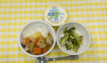 全粥・野菜のとろみ煮・ブロッコリーのとろみ煮てりやき野菜丼・ブロッコリーのおかか和え・牛乳プリン牛乳・スナックパン…