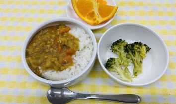 全粥・肉じゃが・ブロッコリーのおかか和えカレーライス・ブロッコリーのおかか和え・オレンジ一歳からのサッポロポテト・牛乳…