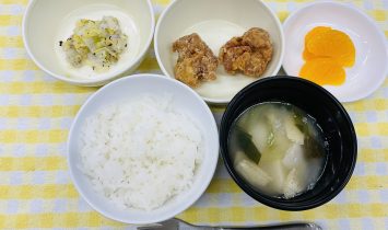 全粥・鶏のとろみ煮・茹で白菜・味噌汁御飯・鶏のから揚げ・白菜のゆかり和え・味噌汁・みかん缶かぼちゃの豆腐パン・牛乳…