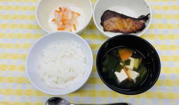 全粥・鮭のほぐし・なます・豆腐すまし汁御飯・ぶりの照り焼き・なます・豆腐すまし汁マリービスケット・牛乳…