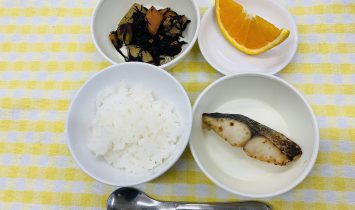 全粥・さわらのしょうゆ焼き・ひじきとさつま芋の炒り煮御飯・さわらのしょうゆ焼き・ひじきとさつま芋の炒り煮・オレンジおはぎ・牛乳…