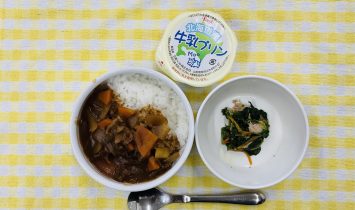 全粥・肉じゃが・ほうれん草のツナ和えハヤシライス・ほうれん草のツナ和え・牛乳プリン一歳からのサッポロポテト・牛乳…