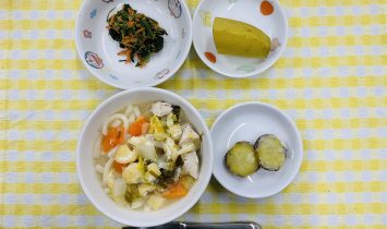 味噌煮込みうどん・さつま芋の甘煮・ほうれん草の和えもの味噌煮込みうどん・さつま芋のさくさくあげ・ほうれん草のごま和え・バナナ牛乳・チャーハン…