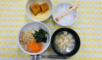 野菜粥・かぼちゃの甘煮・みそ汁三色どんぶり・かぼちゃの甘煮・五目みそ汁・チーズじゃこトースト・牛乳…