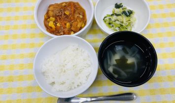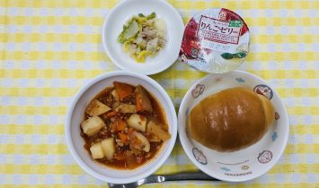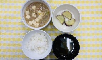 全粥・豆腐のあんかけ・さつま芋の甘煮・野菜スープ御飯・マーボー豆腐・さつま芋のレモン煮・わかめスープ牛乳・ミニ肉まん…