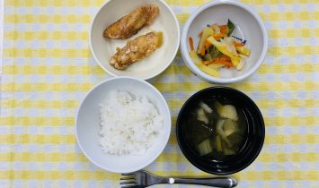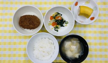 全粥・ささみのとろみ煮・野菜のおかか和え・豆腐みそ汁御飯・メンチカツ・野菜のおかか和え・豆腐みそ汁・バナナさつま芋スティック・牛乳…
