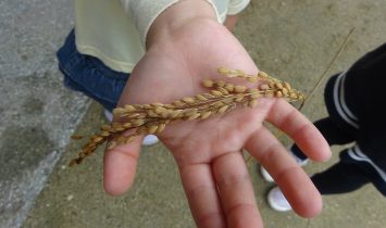 稲穂を脱穀して、もみすりをしました。脱穀は割り箸を使い、取れたお米は、すり鉢に入れてボールを使い、もみすりしました。「カリカリいい音がする!」たくさんある稲穂を見て、「昔の人は大変だね」と呟く子もいました。平井先生からお米ができるまでの過程を教えていた…