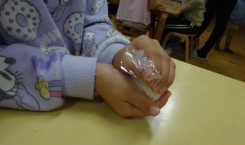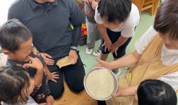 収穫した新米を炊いて、 おにぎりにして食べました。炊けるのを待っている間も お米のいいにおいがしてきて、「早く食べたい!」 とウキウキするらいおん組さん。ご飯が炊け食べてみると、 「なんかいつもよりあまい!」 「もう一回おかわりしたい!」 と大好評でした! …