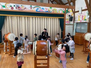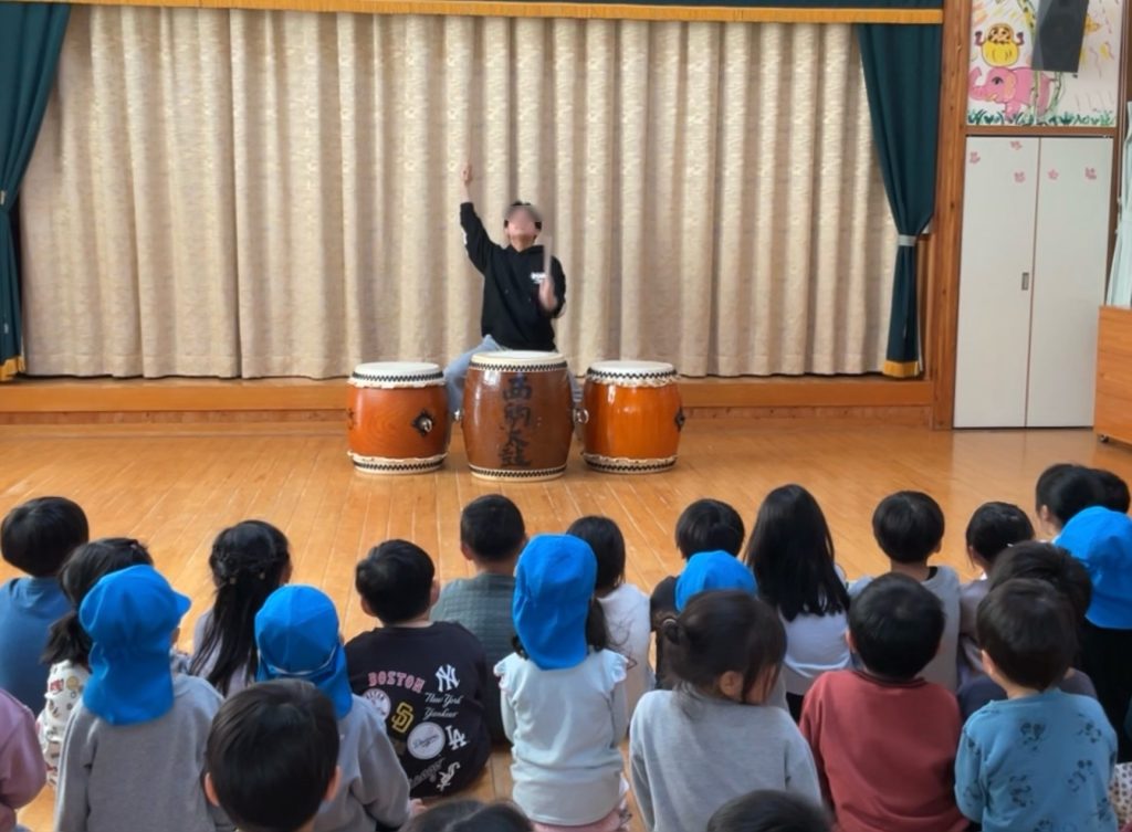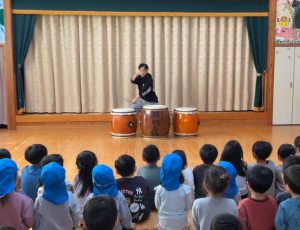 らいおんぐみ、きりんぐみの太鼓練習の後、卒園児のお兄さんが来てくれ、太鼓を披露していただきました。