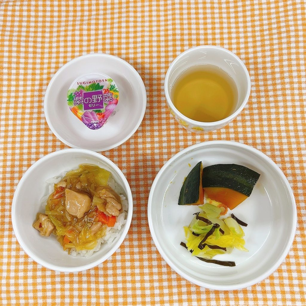 照り焼き野菜丼白菜の塩昆布和えかぼちゃの甘煮ミニゼリー