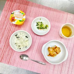 わかめごはん鶏肉のマーマレード焼きキャベツとほうれん草の塩ごま和えゼリー…