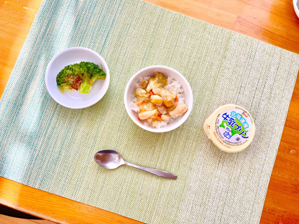 照り焼き野菜丼ブロッコリーのおかか和え牛乳プリン…