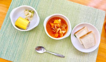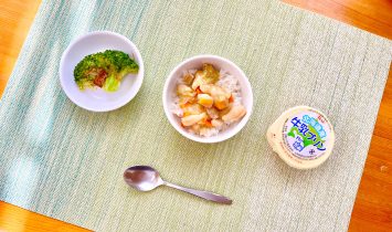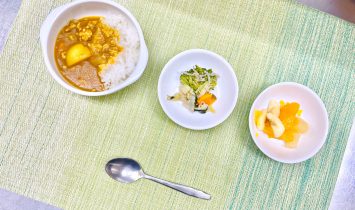 さつまいもご飯うさぎハンバーグブロッコリーの三色サラダすまし汁…