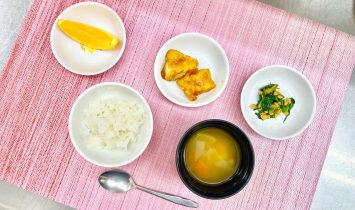 ご飯鶏のから揚げじゃがいもきんぴらみそ汁りんご…