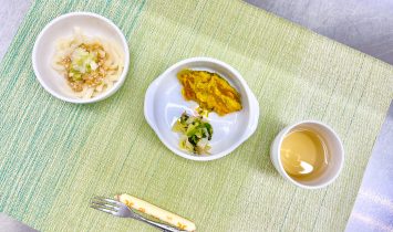 三色丼ぶりかぼちゃの甘煮五目みそ汁チーズ棒…