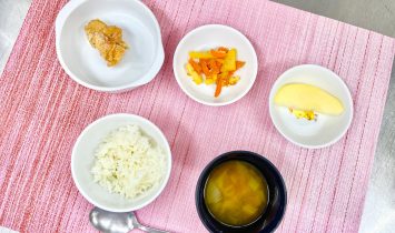 ご飯かじきのカレーあんかけベイクド里芋みそ汁りんご…