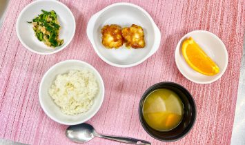 ご飯鶏のから揚げじゃがいもきんぴらすまし汁オレンジ…
