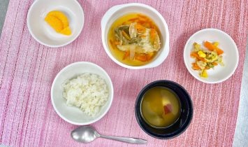 三色丼ぶりかぼちゃの甘煮五目みそ汁チーズ棒…