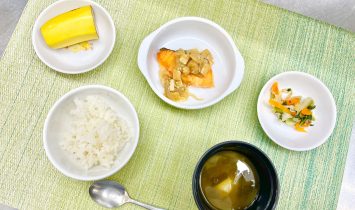 ご飯サバのみそ煮かぼちゃとブロッコリーの和風あんバナナ…