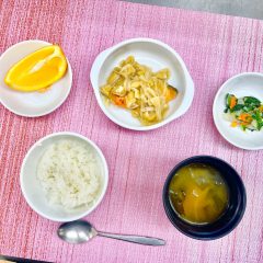 <1・2歳児>ご飯ささみのレモン煮キャベツとほうれん草の磯和えみそ汁<おやつ>芋もち牛乳…
