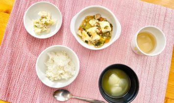 ご飯豆腐の野菜そぼろ煮キャベツのサラダじゃがいものスープ煮…