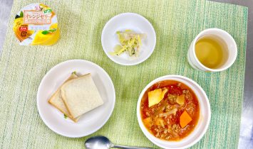 食パン野菜のトマト煮白菜のサラダフルーツゼリー…