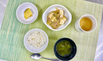 ご飯厚揚げのケチャップ煮小松菜のしらすサラダわかめスープ…