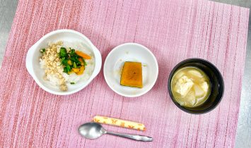 三色丼ぶりかぼちゃの甘煮五目みそ汁チーズ棒…