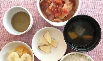 ご飯鶏肉のトマトソース煮ベイクドじゃが冬瓜のスープフルーツカクテル…